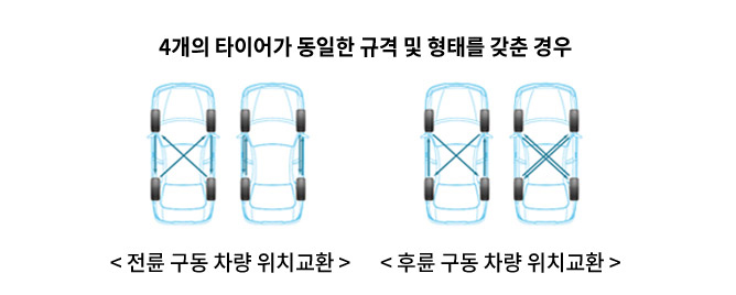 이렇게 주기적으로 위치교환하면 타이어를 경제적으로 사용할 수 있습니다.